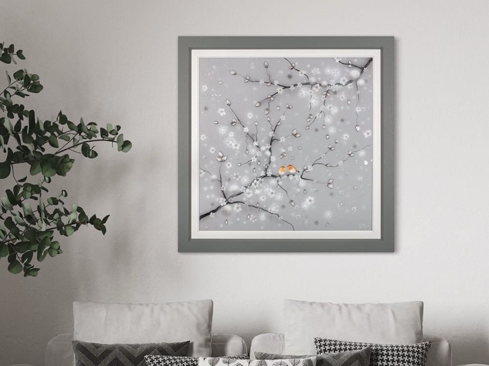 On Watch – Set against Kealey’s signature pale grey background, this gentle and heartfelt piece features two robins perched side by side among delicate branches. With subtle embellishments and soft detailing, On Watch evokes memory, companionship, and quiet guardianship.