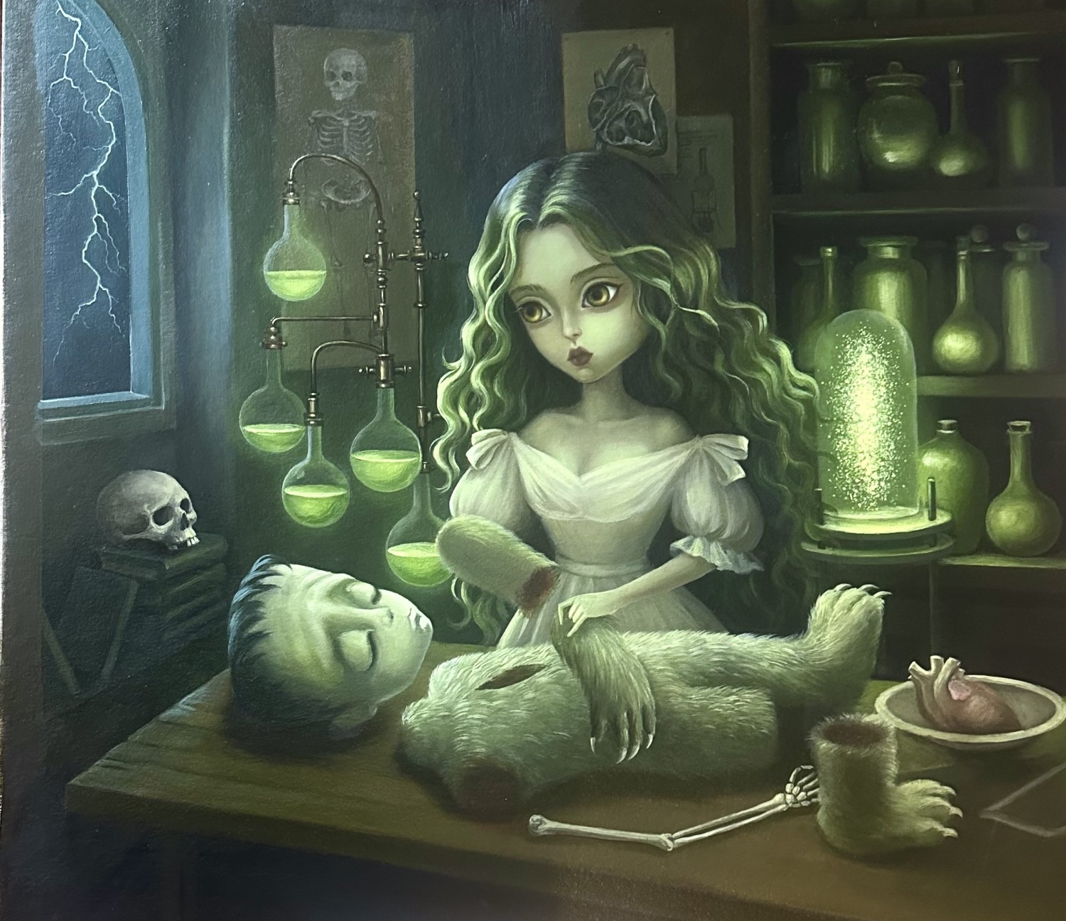 In Echo of Life, Xue Wang delves into the timeless themes of creation, transformation, and identity — the same questions that haunted Shelley’s original Frankenstein. One of the standout works in the exhibition, “Furankenstein”, reimagines the iconic tale through Wang’s distinct lens of surrealist pop-realism. With her porcelain-skinned figures, playful anthropomorphism, and darkly whimsical details, Wang captures the tension between innocence and monstrosity, humour and melancholy, that has always defined Shelley’s myth.